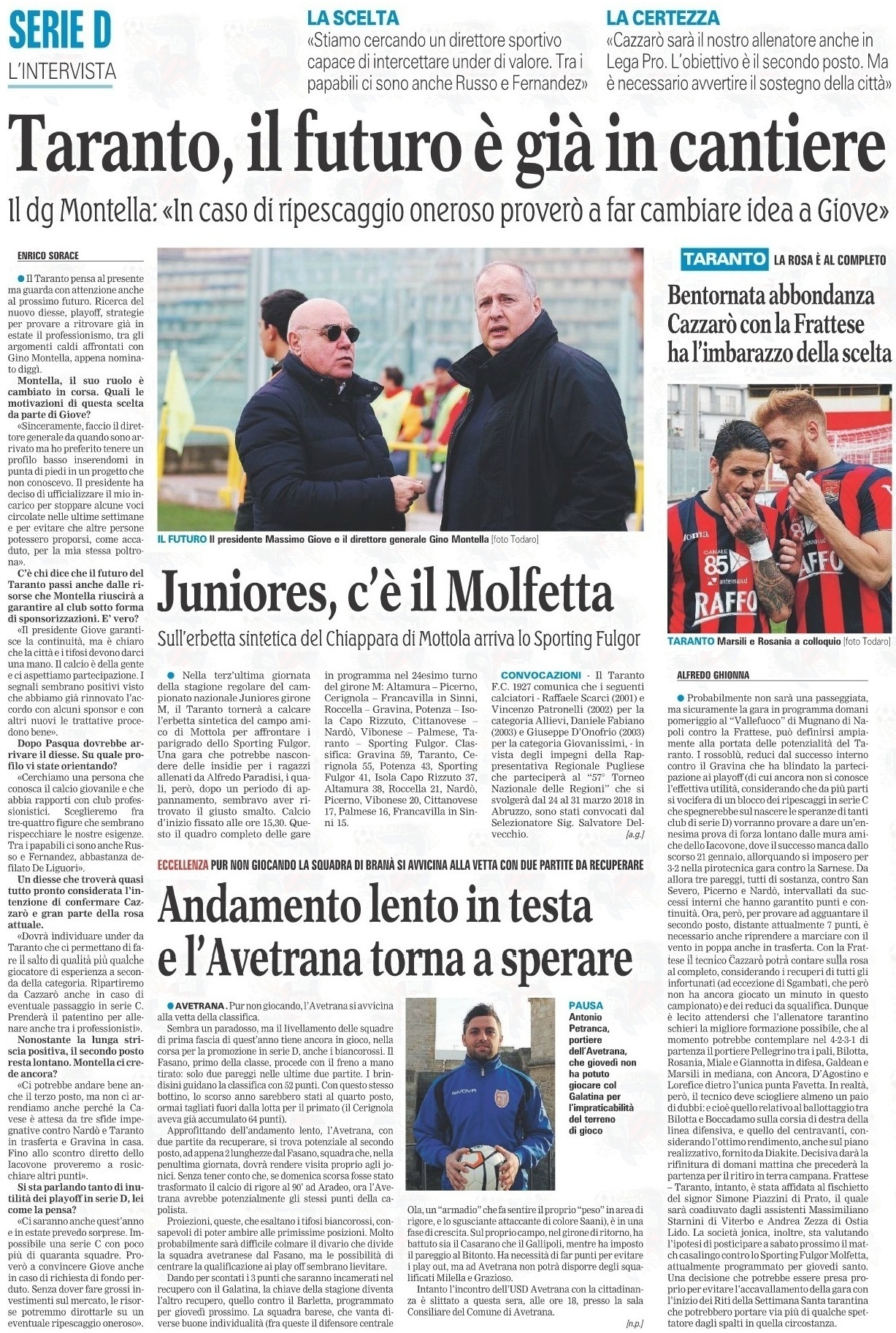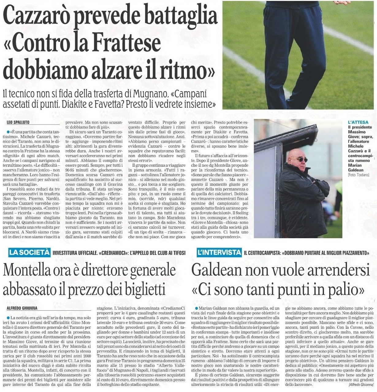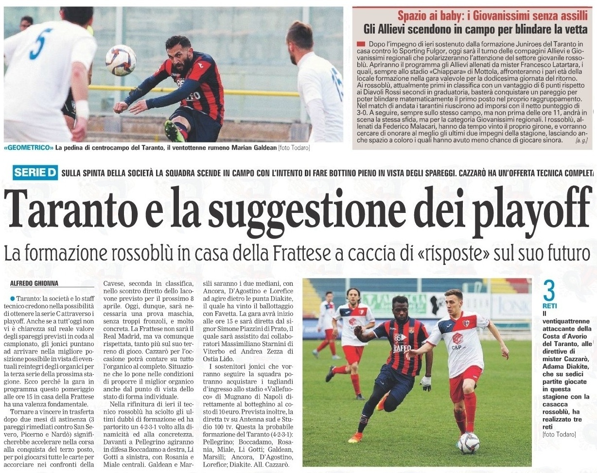 Carissimo me la ricordo eccome giocatori con gli attributi non viziati come quelli di ora , io concordo con te sullo squadrone , ma oltre quello deve esserci organizzazione a partire dal settore giovanile che praticamente è il futuro delle piccole società , se a Taranto ogni anno cambia sempre tutto dalla squadra allo staff tecnico dal presidente al magazziniere dove vogliamo andare ? Credimi la gente è stanca di sentire sempre le solite cose senza mai vedere ciò che si promette , speriamo sia la volta buona .