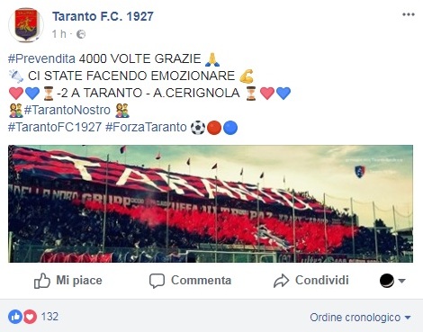 Secondo il N1 del Cerignola il Taranto avrebbe abbassato i prezzi dei biglietti perché arriva l'Audace!! Ma chi sono questi il Barcellona per caso? Dobbiamo stare a spiegare a questi personaggi chi e quali squadre hanno calcato l'erbetta dello Iacovone?! Il nostro presidente ha tagliato il costo dei tagliandi a prescindere dall'avversario di turno, avrebbe fatto la stessa cosa anche se ci fossimo trovati l'ultima in classifica.. Qui più di qualcuno si è montato la testa e domenica la squadra in campo con umiltà e la gente sugli spalti faranno capire le differenze che intercorre fra un paese di provincia sperduta tra le siepi daune, con una vera CITTA capoluogo!!