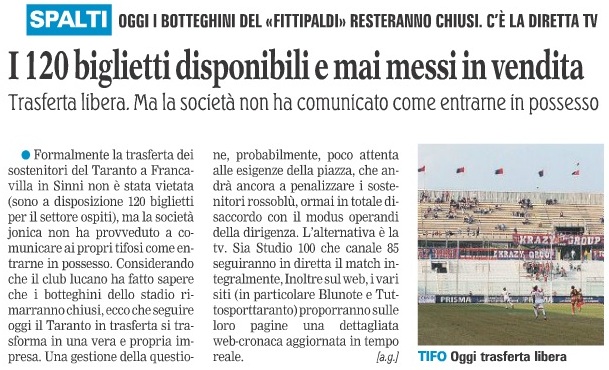 Ci hanno detto che fra la passata gestione,serie C,e questa ,il "DUO",ha speso 3 mil.di euro(da credersi poco).Certo che in ns imprenditori sanno fare impresa visto i risultati.Poi il ds,voluto dal "duo",homo sapiens del calcio nostrano,ci ha propinato over,detto da lui,da "spogliatoio" ed under tra i migliori,cacciando altrove i ns,detto dal ds,non ancora pronti per la ns piazza.Ora questi ultimi sarebbero stati,in questo particolare momento,indispensabili,senza dimenticare che lo scorso anno,hanno raggiunto,con la berettti,i quarti di finale al nazionale.Ma mi faccio una domanda:Ma dov'è che l' vanne a pighin'certi "eruditi"del pallone?E come mai rimane,il ds,in società visto che è l'unico artefice del disastro TA?Misteri del calcio nostrano.